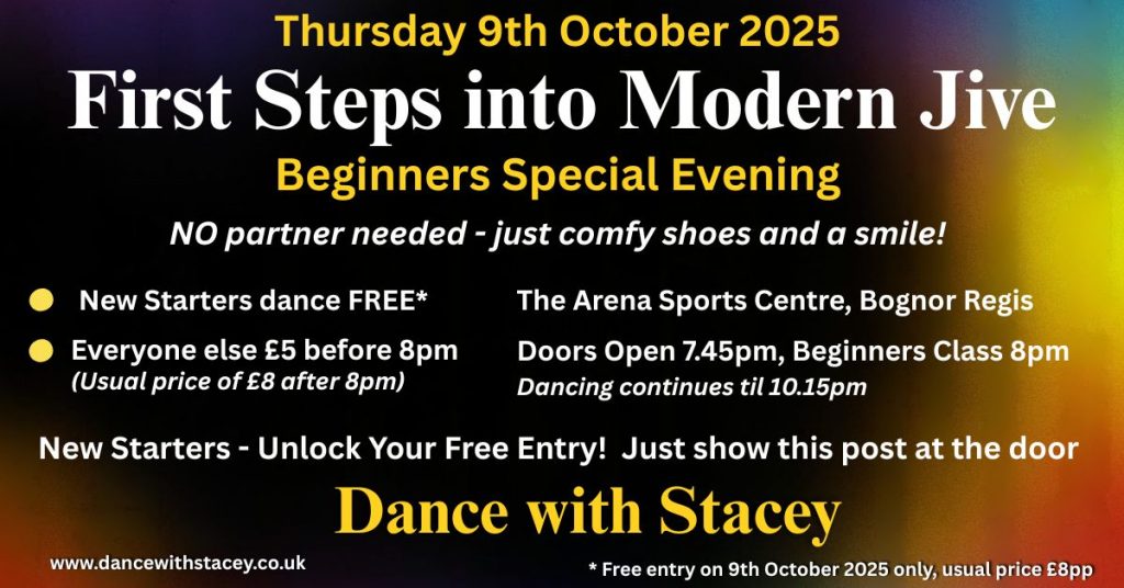 Join us on Thursday 9th October at The Arena, Bognor Regis for our Special Beginner’s Evening – And for New Starters tonight will be absolutely FREE!* Just show this post at the door. (All other dancers only pay £5 if you arrive before 8pm, Normal £8 price after 8pm). For more details click here